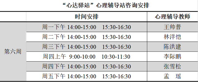 为更好地为公海赌赌船官网jc710学子提供生活成长全方位的指导,帮助员工解决生涯规划、学业压力和生活困惑等问题,搭建一个开放的、更具针对性的交流平台,公海赌赌船官网jc710“心达驿站”心理辅导站将于本学期第六周继续开放,充分发挥学工队伍的专长为同学们的成长服务。学工队伍教师作为固定团队采取值班咨询制。