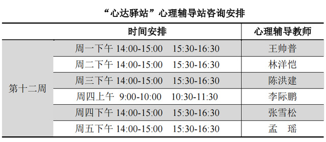 为更好地为公海赌赌船官网jc710学子提供生活成长全方位的指导,帮助员工解决生涯规划、学业压力和生活困惑等问题,搭建一个开放的、更具针对性的交流平台,公海赌赌船官网jc710“心达驿站”心理辅导站将于本学期第十二周继续开放,充分发挥学工队伍的专长为同学们的成长服务。学工队伍教师作为固定团队采取值班咨询制。