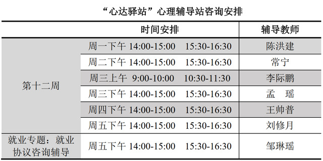 为更好地为公海赌赌船官网jc710学子提供生活成长全方位的指导,帮助员工解决生涯规划、学业压力和生活困惑等问题,搭建一个开放的、更具针对性的交流平台,公海赌赌船官网jc710“心达驿站”心理辅导站将于本学期第十二周继续开放,充分发挥学工队伍的专长为同学们的成长服务。学工队伍教师作为固定团队采取值班咨询制。
