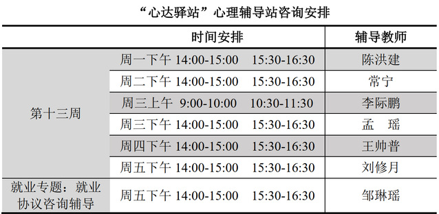 为更好地为公海赌赌船官网jc710学子提供生活成长全方位的指导,帮助员工解决生涯规划、学业压力和生活困惑等问题,搭建一个开放的、更具针对性的交流平台,公海赌赌船官网jc710“心达驿站”心理辅导站将于本学期第十三周继续开放,充分发挥学工队伍的专长为同学们的成长服务。学工队伍教师作为固定团队采取值班咨询制。