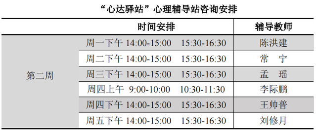 为更好地为公海赌赌船官网jc710学子提供生活成长全方位的指导,帮助员工解决生涯规划、学业压力和生活困惑等问题,搭建一个开放的、更具针对性的交流平台,公海赌赌船官网jc710“心达驿站”心理辅导站将于本学期第二周继续开放,充分发挥学工队伍的专长为同学们的成长服务。学工队伍教师作为固定团队采取值班咨询制。