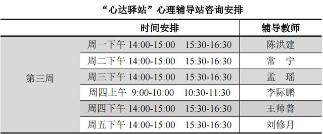 为更好地为公海赌赌船官网jc710学子提供生活成长全方位的指导,帮助员工解决生涯规划、学业压力和生活困惑等问题,搭建一个开放的、更具针对性的交流平台,公海赌赌船官网jc710“心达驿站”心理辅导站将于本学期第三周继续开放,充分发挥学工队伍的专长为同学们的成长服务。学工队伍教师作为固定团队采取值班咨询制。