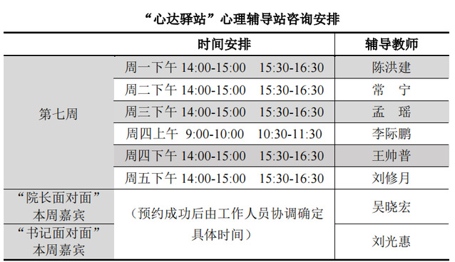为更好地为公海赌赌船官网jc710学子提供生活成长全方位的指导,帮助员工解决生涯规划、学业压力和生活困惑等问题,搭建一个开放的、更具针对性的交流平台,公海赌赌船官网jc710“心达驿站”心理辅导站将于本学期第七周继续开放,充分发挥学工队伍的专长为同学们的成长服务。学工队伍教师作为固定团队采取值班咨询制。