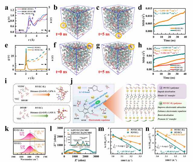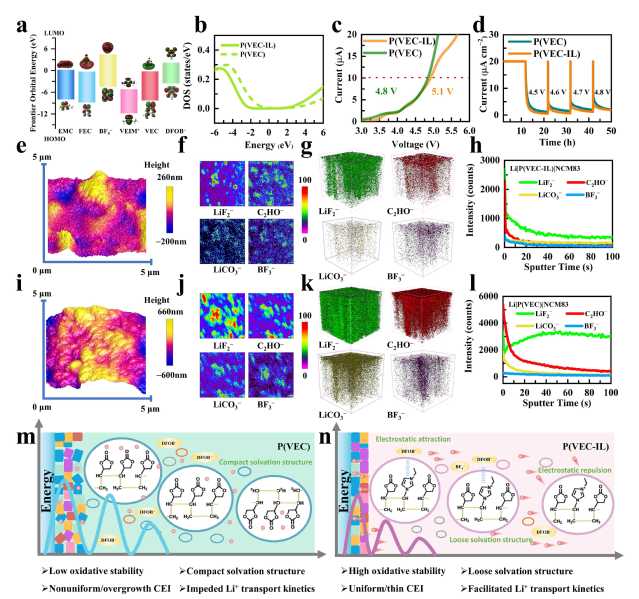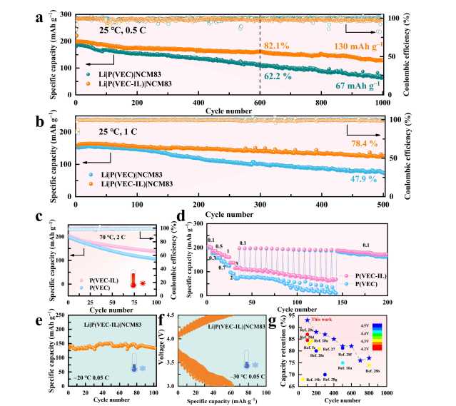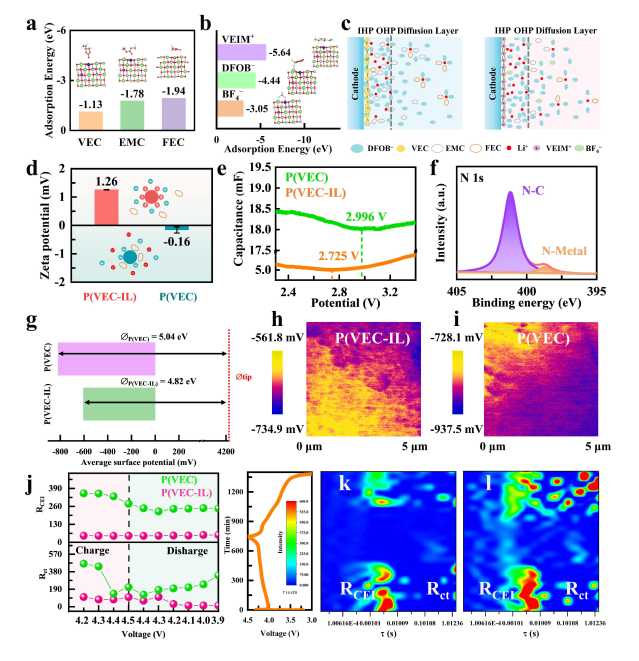 该研究通过原位聚合优先吸附在LiNi0.83Co0.11Mn0.06O2(NCM83)表面的1-乙烯基-3-乙基咪唑(VEIM)阳离子,在内亥姆霍兹平面内设计了一个均匀且高度抗氧化的聚合物层,诱导形成了具有快速界面动力学的阴离子衍生阴极-电解质界面相。同时,[VEIM][BF4]和乙烯基碳酸乙烯酯(VEC)的共聚赋予P(VEC-IL)共聚物带正电荷的咪唑基团,提供正电场以促进Li+的传输和脱溶过程。因此,Li||NCM83电池的截止电压高达4.5V,在25°C下循环1000次后显示出130mAh·g-1的出色可逆容量,在-20°C下循环100次后显示出134mAh·g-1的可观放电容量,且无容量衰减。该研究深入了解了如何通过阳离子特异性吸附为高电压准固态LMBs量身定制双电层。