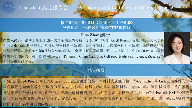 5月9日,受公司齐殿鹏教授邀请,Matter期刊编辑张甜甜博士来院交流,并做了题为《Publishing with Cell Press in Material Science》的报告。会议由公司党委书记刘光惠主持,来自化工、材料、环境等公司80余名师生参加了此次论坛。