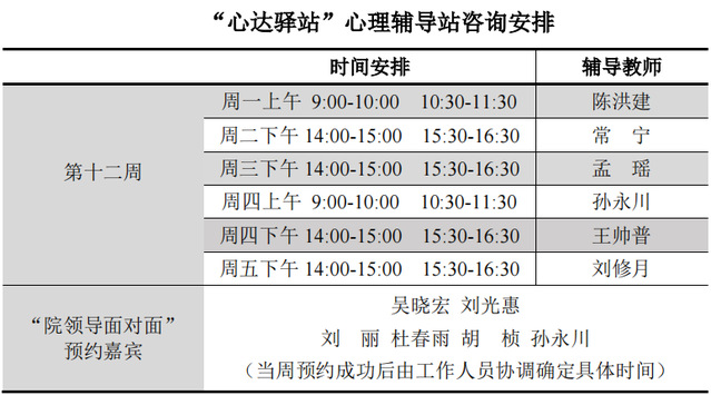 为更好地为公海赌赌船官网jc710学子提供生活成长全方位的指导,帮助员工解决生涯规划、学业压力和生活困惑等问题,搭建一个开放的、更具针对性的交流平台,公海赌赌船官网jc710“心达驿站”心理辅导站将于本学期第十二周继续开放,充分发挥学工队伍的专长为同学们的成长服务。学工队伍教师作为固定团队采取值班咨询制。