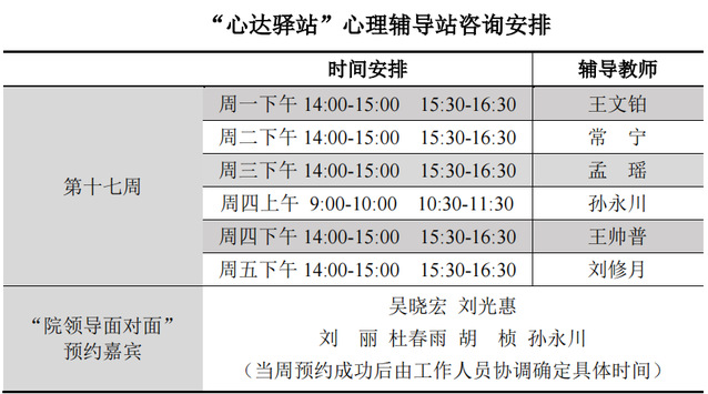 为更好地为公海赌赌船官网jc710学子提供生活成长全方位的指导,帮助员工解决生涯规划、学业压力和生活困惑等问题,搭建一个开放的、更具针对性的交流平台,公海赌赌船官网jc710“心达驿站”心理辅导站将于本学期第十七周继续开放,充分发挥学工队伍的专长为同学们的成长服务。学工队伍教师作为固定团队采取值班咨询制。