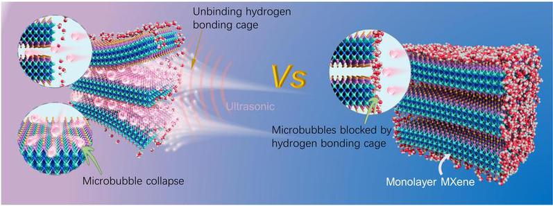 团队经多年研究发现,多层MXene终端的含氧官能团与水分子之间形成的氢键笼结构是阻碍其难以高效剥离的重要原因。在70°C和适中的超声功率条件下,氢键笼约束被显著削弱,使得超声空化产生的微气泡能更容易渗透到多层MXene的层间,从而实现温和且彻底的剥离。通过这一方法,仅需数十分钟便可高效制备出高质量和大尺寸的单层MXene,产率高达95%,产量远超传统方法。