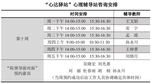 为更好地为公海赌赌船官网jc710学子提供生活成长全方位的指导,帮助员工解决生涯规划、学业压力和生活困惑等问题,搭建一个开放的、更具针对性的交流平台,公海赌赌船官网jc710“心达驿站”心理辅导站将于本学期第十周继续开放,充分发挥学工队伍的专长为同学们的成长服务。学工队伍教师作为固定团队采取值班咨询制。