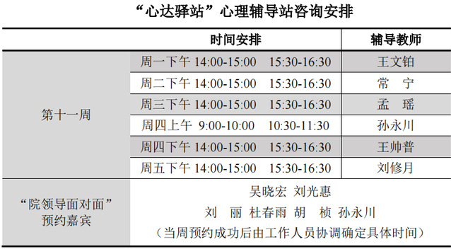 为更好地为公海赌赌船官网jc710学子提供生活成长全方位的指导,帮助员工解决生涯规划、学业压力和生活困惑等问题,搭建一个开放的、更具针对性的交流平台,公海赌赌船官网jc710“心达驿站”心理辅导站将于本学期第十一周继续开放,充分发挥学工队伍的专长为同学们的成长服务。学工队伍教师作为固定团队采取值班咨询制。