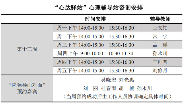 为更好地为公海赌赌船官网jc710学子提供生活成长全方位的指导,帮助员工解决生涯规划、学业压力和生活困惑等问题,搭建一个开放的、更具针对性的交流平台,公海赌赌船官网jc710“心达驿站”心理辅导站将于本学期第十三周继续开放,充分发挥学工队伍的专长为同学们的成长服务。学工队伍教师作为固定团队采取值班咨询制。