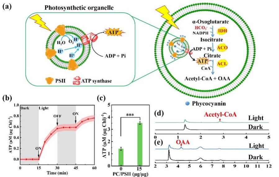 基于上述挑战,韩晓军教授团队模拟了叶绿体的工作机制,构建了人造光合细胞,实现了光控固碳。团队将ATP合酶和光系统II(PSII)纯化并重组到磷脂囊泡膜上,制备出光合细胞器,并引入藻蓝蛋白增强其光收集能力,提高光能利用效率和ATP的产量。团队将异柠檬酸脱氢酶(IDH)、乌头酸酶(ACO)和ATP柠檬酸裂解酶(ACL)级联,建立了碳固定途径,使α-酮戊二酸(5碳)转化为乙酰辅酶A(2碳)和草酰乙酸(4碳),并将光合细胞器、藻蓝蛋白和碳固定途径成功包封到巨型磷脂囊泡内,构建出人造光合细胞。在光照下,人造光合细胞成功将α-酮戊二酸转化为乙酰辅酶A和草酰乙酸,光反应能量供应模块与碳固定酶级联模块的耦合实现了光控固碳,模拟了叶绿体功能。其产物乙酰辅酶A是细胞合成代谢中合成胆固醇和脂肪酸的关键中间体。该成果不仅显著提升了光合细胞器的能量转化效率,还在人造细胞内部实现了光控固碳,为自下而上构建具有高度复杂代谢网络的自供能人造细胞奠定了基础。