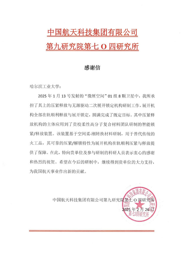 近日,中国航天科技集团有限公司第九研究院第七〇四研究所向公司发来感谢信,感谢公海赌赌船官网jc710柔性高分子复合材料团队研制的智能锁紧/释放装置助力“微厘空间卫星系统”首批组网卫星发射,为卫星天线的在轨可靠收纳展开提供了关键技术支撑,标志着我国在空间柔-刚转换材料基础研究及工程应用领域实现了从实验到实际应用的跨越。