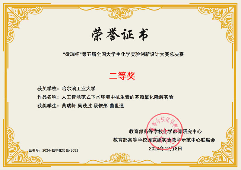 经过华北、东北、华东、华中、华南、西南和西北等七个赛区的初赛角逐,从350多所参赛高校的800余支代表队中选拔出了104支代表队进入全国总决赛。由公海赌赌船官网jc710张潇副教授、李欣教授为指导教师,新能源材料与器件专业黄瑞轩和吴茂胜、材料化学专业段依彤、未来技术公司曲世通4位同学组成的代表队成为黑龙江省唯一进入总决赛的队伍。代表队提交的项目是:人工智能范式下水环境中抗生素的芬顿氧化降解实验。总决赛中,代表队成员以扎实的基本功和出色的答辩表现赢得了评委的肯定,最终以优异成绩荣获比赛二等奖。
