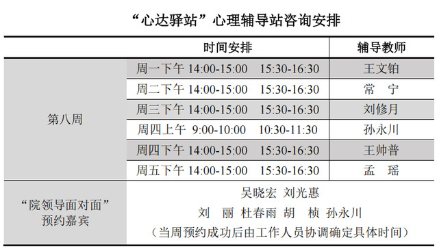 为更好地为公海赌赌船官网jc710学子提供生活成长全方位的指导,帮助员工解决生涯规划、学业压力和生活困惑等问题,搭建一个开放的、更具针对性的交流平台,公海赌赌船官网jc710“心达驿站”心理辅导站将于本学期第八周继续开放,充分发挥学工队伍的专长为同学们的成长服务。学工队伍教师作为固定团队采取值班咨询制。