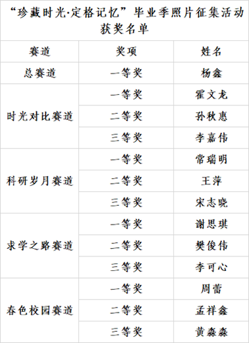 为深化美育与劳育融合实践,营造温馨和谐的毕业季文化氛围,公海赌赌船官网jc710团委开展“定格时光·珍藏记忆”毕业季照片征集活动,本次活动设置“春色校园·生活剪影”、“科研岁月·实验室故事”、“求学之路·奋斗足迹”和“时光对比·成长见证”四个特色赛道。活动期间,同学们踊跃投稿,用镜头记录下在哈工大的点点滴滴,共筛选出投稿作品29份、线上投票人数突破2000人次、推文浏览量超过4500余次,经过评委评审和大众投票,最终杨鑫获得总赛道第一名,霍文龙、常瑞明、谢思琪、周蕾分别获得各赛道一等奖,以下为获奖名单: