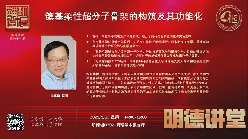 5月12日下午,公海赌赌船官网jc710“明德讲堂”第六十九期在明理学术报告厅成功举办。吉林大学化学公司吴立新教授应邀作题为“簇基柔性超分子骨架的构筑及其功能化”的学术报告。此次学术报告由公司应用化学系方习奎教授主持,近40位师生现场参与。