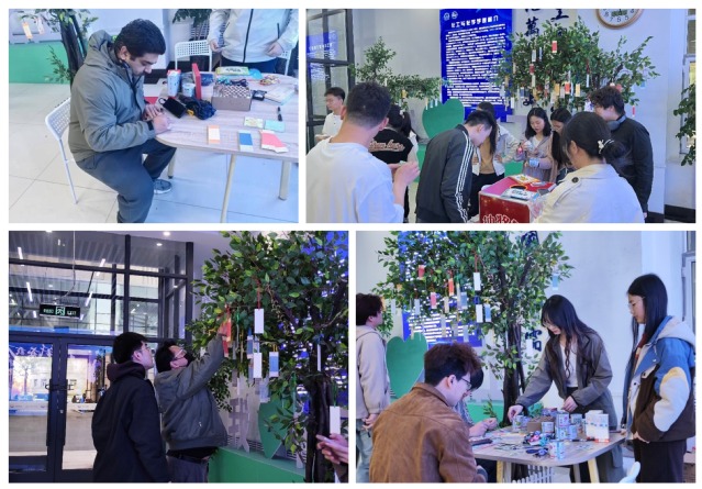 活动现场设置三大主题区域,绿意盎然的留言树上已挂满师生书写的五色信笺与定制卡片,参与者通过文字、涂鸦等形式记录对师友的祝福、校园眷恋或未来期许;折纸体验区配备彩色卡纸及教程手册,千纸鹤、纸飞机等折纸作品既可悬挂枝头,亦可留存纪念;漂流瓶传递箱前,参与者可将匿名寄语投入漂流瓶并随机抽取他人留言,部分漂流瓶设置互动任务以增添趣味。