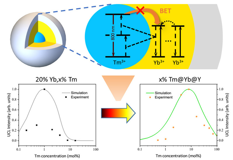 团队开发了一种基于六角相NaYF4的异质核-壳-壳纳米结构(NaYF4:Tm3+@NaYbF4@NaYF4),其中,激活剂离子Tm3+和敏化剂离子Yb3+分别位于内核和内壳层,而最外部的惰性壳层用于抑制表面猝灭效应。这种设计实现了在低于100 W/cm2的激发强度下对浓度猝灭效应的抑制,可将激活剂离子Tm3+的最优掺杂浓度从传统单核共掺结构NaYF4:Yb3+/Tm3+中的1%提高到8%。机理研究表明,敏化剂和激活剂的空间分离有效抑制了Tm3+向Yb3+的反向能量传递,从而推动了Tm3+最优掺杂浓度的增加。此外,在高激发功率密度下(20 MW/cm2),Tm3+的最优掺杂浓度将进一步提高到50%。这些发现加深了人们对镧系元素发光浓度猝灭效应的理解,为开发明亮的稀土上转换材料提供可能。