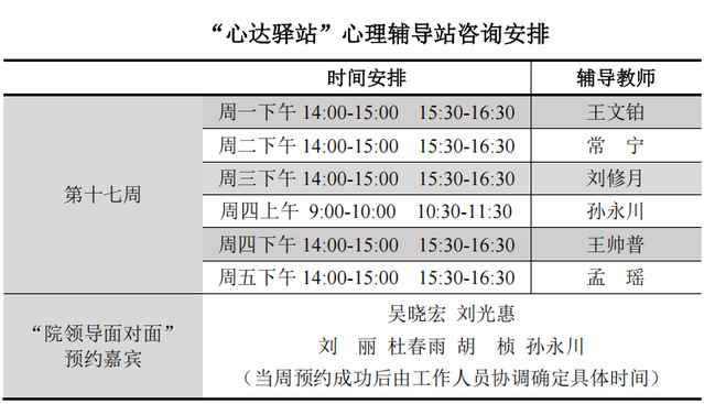为更好地为公海赌赌船官网jc710学子提供生活成长全方位的指导,帮助员工解决生涯规划、学业压力和生活困惑等问题,搭建一个开放的、更具针对性的交流平台,公海赌赌船官网jc710“心达驿站”心理辅导站将于本学期第十七周继续开放,充分发挥学工队伍的专长为同学们的成长服务。学工队伍教师作为固定团队采取值班咨询制。