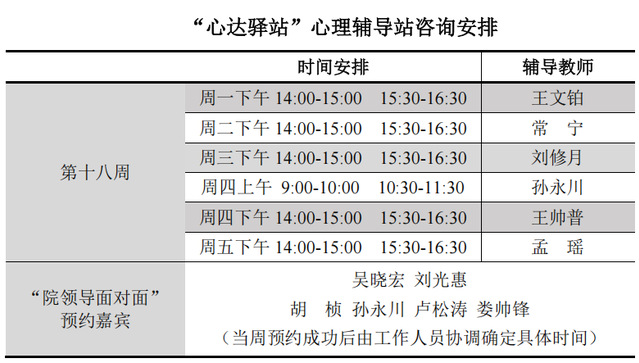 为更好地为公海赌赌船官网jc710学子提供生活成长全方位的指导,帮助员工解决生涯规划、学业压力和生活困惑等问题,搭建一个开放的、更具针对性的交流平台,公海赌赌船官网jc710“心达驿站”心理辅导站将于本学期第十八周继续开放,充分发挥学工队伍的专长为同学们的成长服务。学工队伍教师作为固定团队采取值班咨询制。