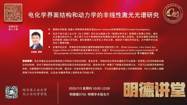 电化学催化反应的机理受热力学和动力学综合控制,复杂多变。传统的电化学和光谱技术可以获得一些界面上的活性物质在稳态时的结构,但对于超快的电荷传递过程往往缺乏有效的检测手段。报告将介绍一种基于飞秒激光的检测方法,不仅可以检测活性物种的结构,还能跟踪它们的超快动力学过程。通过这一先进非线性谱学电化学技术,可以成功解析金电极上水的吸附结构、Pt(111)表面上硫酸阴离子的化学和物理性质,以及金/电解质界面上溶剂化电子的动力学。