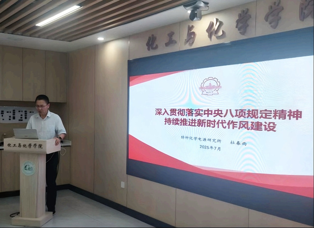 党课讲授结束后,刘光惠指出,学习中央八项规定精神要从点滴之处见落实。在思想上,全体党员同志要时刻保持清醒,将中央八项规定精神融入日常,以高度的政治自觉筑牢作风防线,坚持以优良作风带动党风学风建设;在行动上,要牢固树立为民服务宗旨,坚持为广大师生办实事,多倾听师生心声,切实解决师生实际困难。作风建设永远在路上,特种化学电源研究所师生联合党支部作为全国高校“双带头人”教师党支部书记“强国行” 专项行动团队,全体党员要充分发挥先锋模范作用,以育人实绩与重器再造的实干担当,进一步擦亮党支部特色品牌,不断弘扬优良传统,持续总结凝练支部建设模式与成功经验,努力形成团队建设卓越文化,进一步发挥示范带动效应,引领助推其他支部高质量建设。党支部要以中央八项规定为标尺,持之以恒抓落实,让清风正气在工作生活中扎根,以优良作风为党和人民事业发展凝聚强大力量。